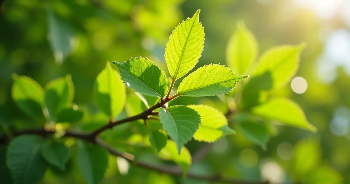 Espécie de árvore de baixa manutenção com folhas em formato de coração, de cor verde-intenso, com um tronco liso e acinzentado, iluminada pela luz do sol da tarde.