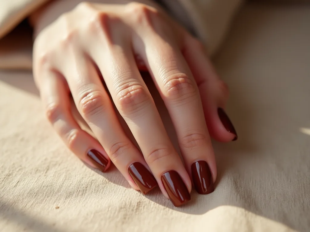 Unhas quadradas com esmalte cremoso cor café escuro, em ambiente com iluminação de estúdio, realçando o brilho.