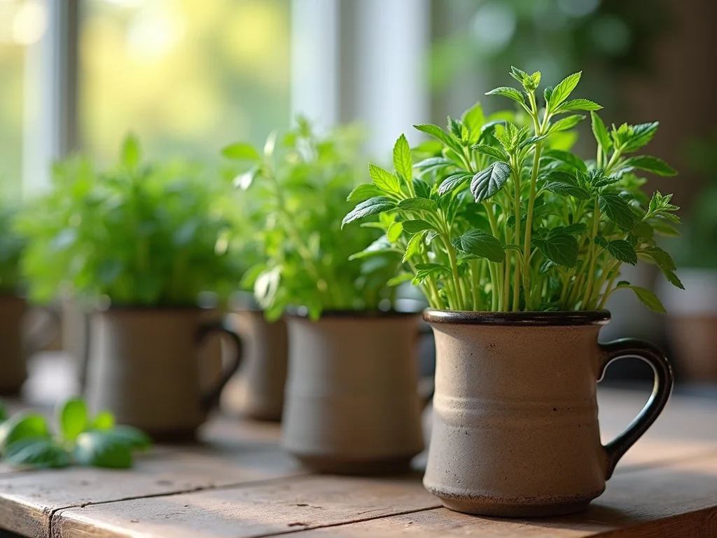 Caneca de café grande, estilo americano, com alça robusta, plantada com uma erva aromática de crescimento rápido, em um peitoril de janela ensolarado.