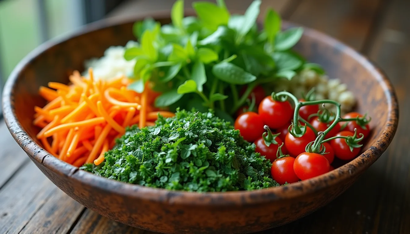 Prato de salada mista com folhas verdes variadas, tomate cereja, pepino e salpicado com ervas frescas picadas, incluindo salsa e cebolinha.