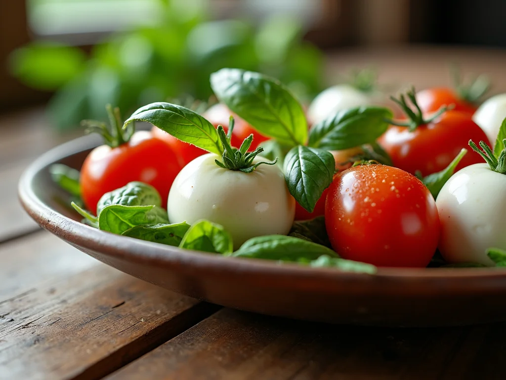| Manjericão Fresco: O Aroma que Transforma | As folhas de manjericão trazem um frescor inconfundível e um aroma que é a alma da Caprese. Rico em compostos benéficos. | Use folhas inteiras ou rasgadas delicadamente. O aroma se intensifica quando manuseado com carinho. | Aromas que alegram a alma e um toque de bem-estar. |